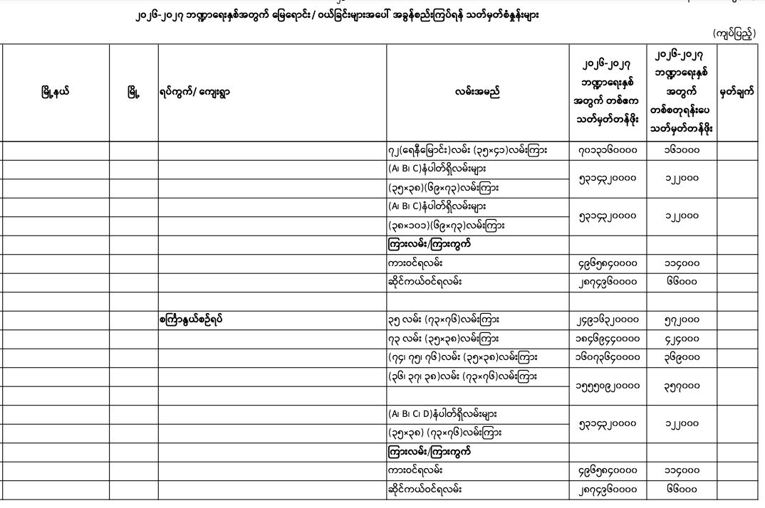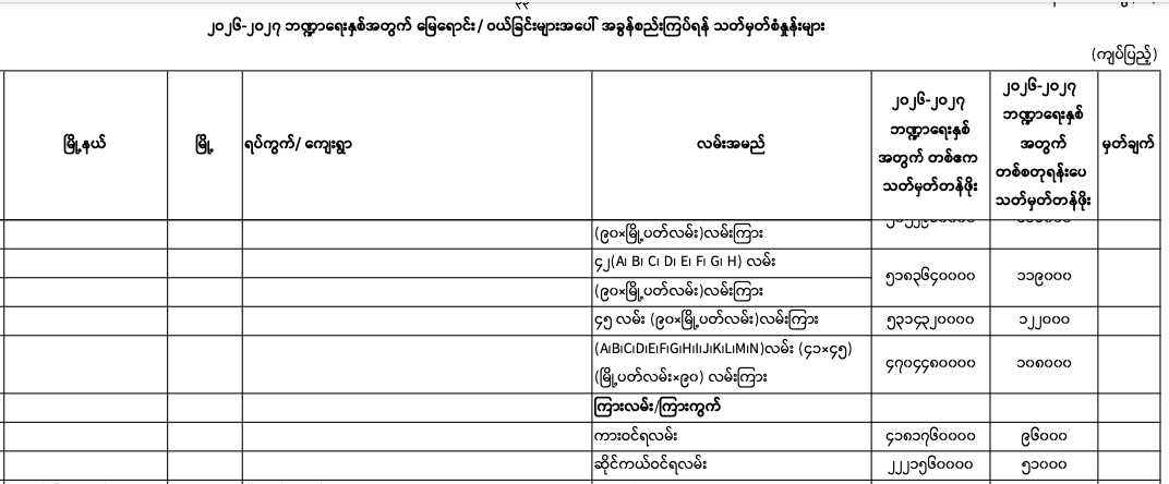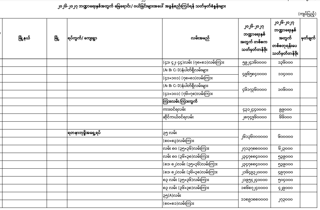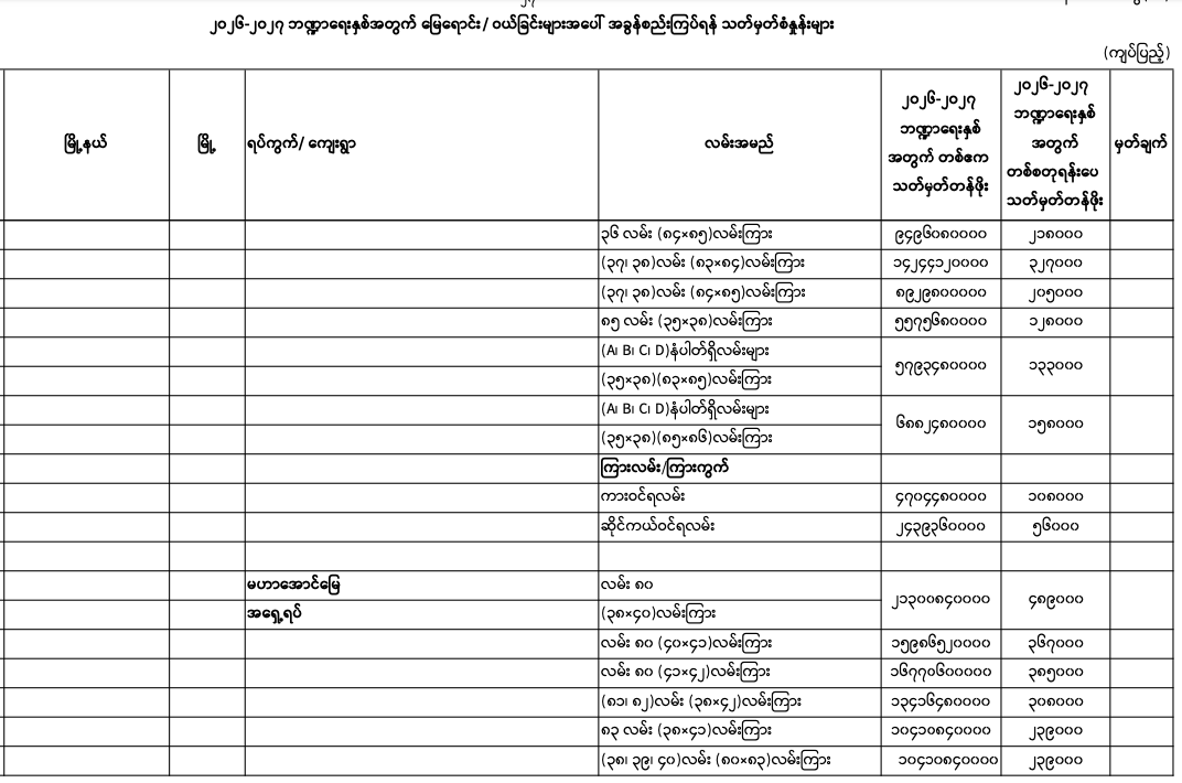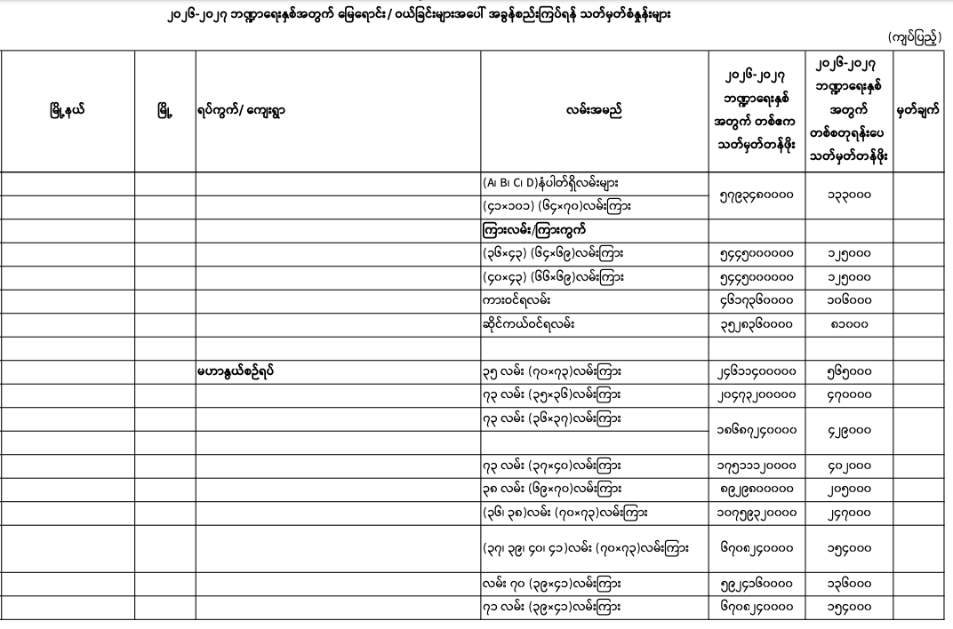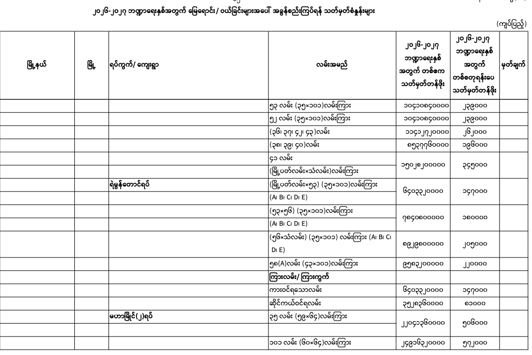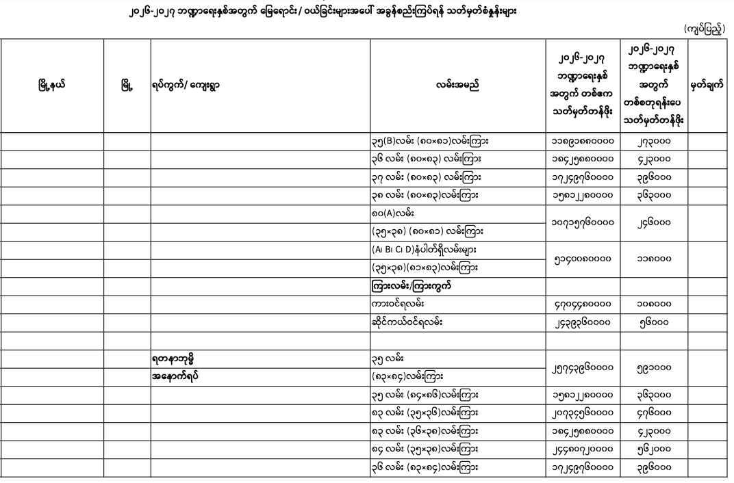 => မန္တလေးတိုင်းဒေသကြီး၊ မဟာအောင်မြေမြို.နယ်၏ ၂၀၂၅-၂၀၂၆ ဘဏ္ဍာရေးနှစ်အတွက် မြေရောင်း/ဝယ်ခြင်း များအပေါ်အခွန်စည်းကြပ်ရန်နှုန်းထားများ