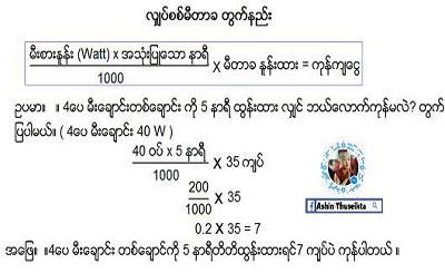 ယနေ့ ခေတ် မှာ နေရာ တော်တော် များများ လျှပ်စစ်မီး ရလာ ကြပါ ပြီ ။ ဒါကြောင့် လျှပ်စစ် အသုံး ပြုခ တွေ မီတာ ကုန်ကျ ခတွေ အကြောင်း လူအများ သိသင့်ပါ တယ် ။