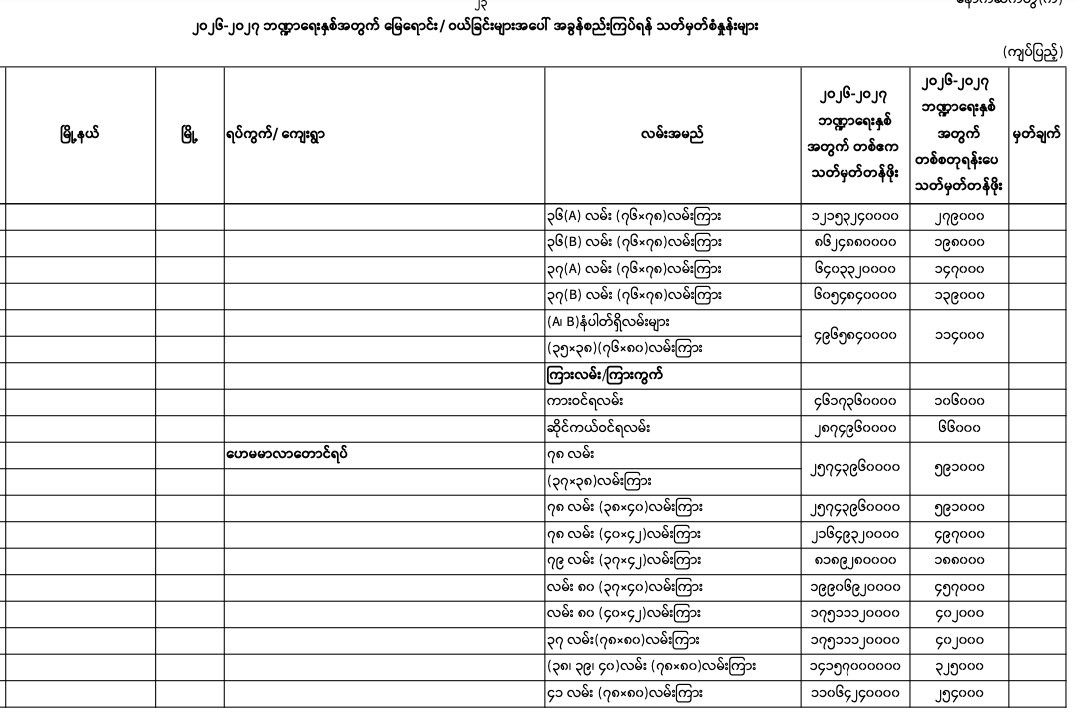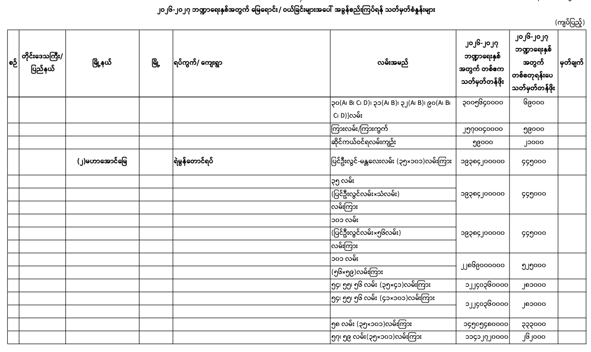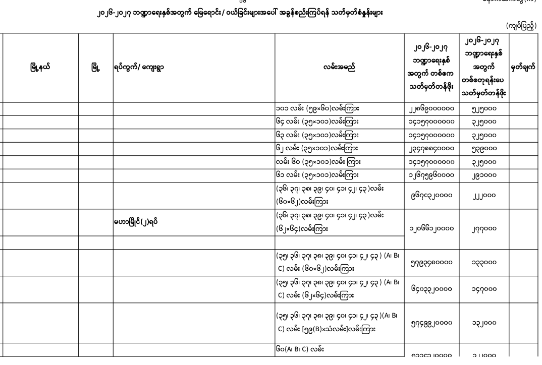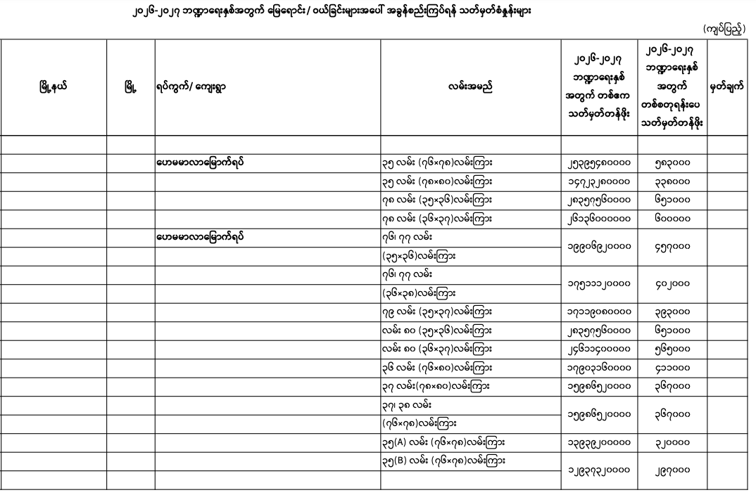 => မန္တလေးတိုင်းဒေသကြီး၊ မဟာအောင်မြေမြို.နယ်၏ ၂၀၂၅-၂၀၂၆ ဘဏ္ဍာရေးနှစ်အတွက် မြေရောင်း/ဝယ်ခြင်း များအပေါ်အခွန်စည်းကြပ်ရန်နှုန်းထားများ